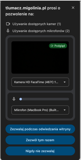 5. Po kliknięciu na „zezwalaj podczas odwiedzania witryny” pojawi się komunikat „Łączę z Tłumaczem PJM”.
